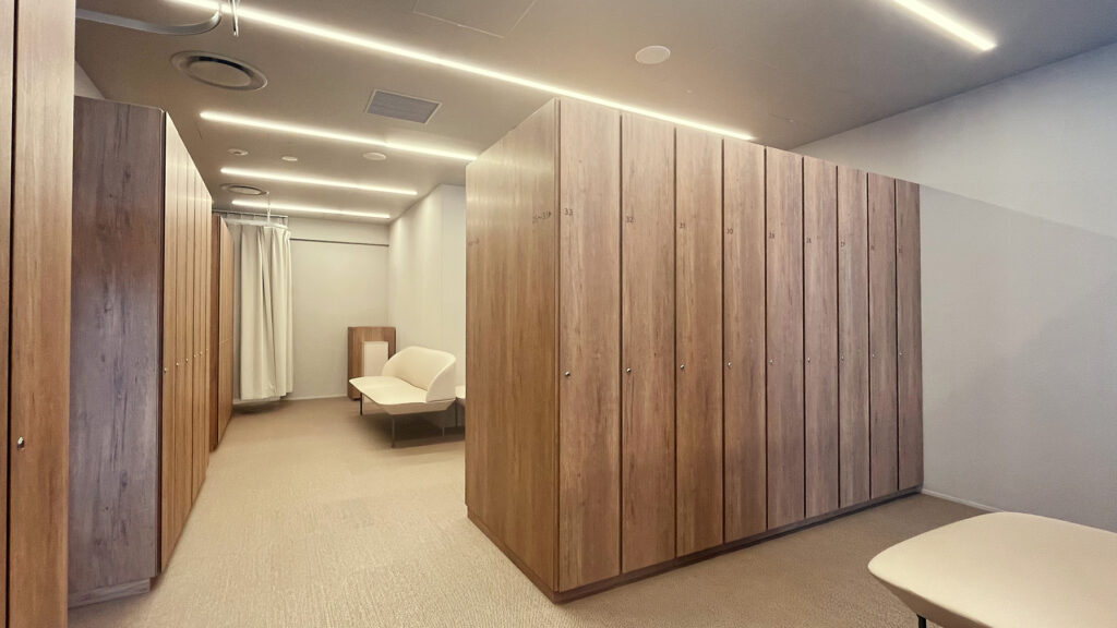 お着替えの時間も快適に過ごせるよう、更衣室を全面リニューアルいたしました。更衣室の面積を広くして、通路を広く確保し、椅子を設置いたしました。カーテンで仕切られたスペースを二ヵ所ご用意いたしましたので、周りの目を気にせずにお着替えいただくことも可能です。